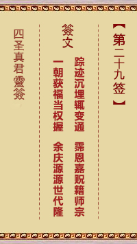 圣意云:久凶向吉,久闭渐通。承恩在上,权握雄雄。诉讼得理,谋运得中。婚姻利益,喜气重重,病者迟痒,交易自从。不宜守旧,恐惨愁容。
