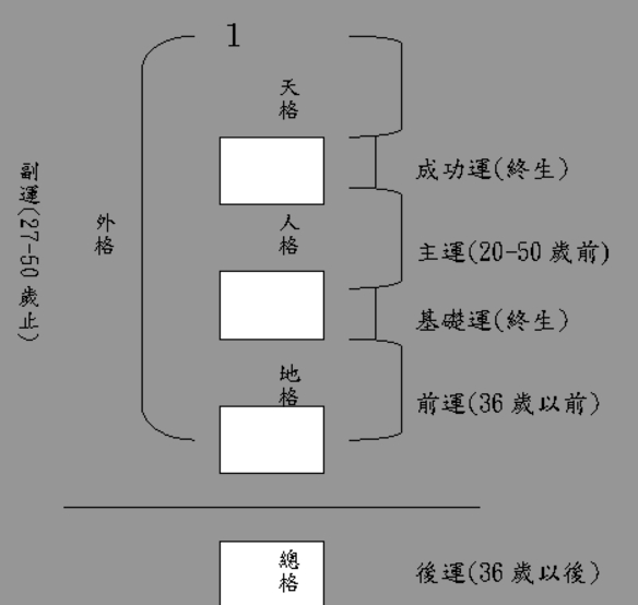 天格與人格之配置主司成功運。人格與地格之配置主司基礎運。人格與外格之配置主司社交運,地就是人緣。